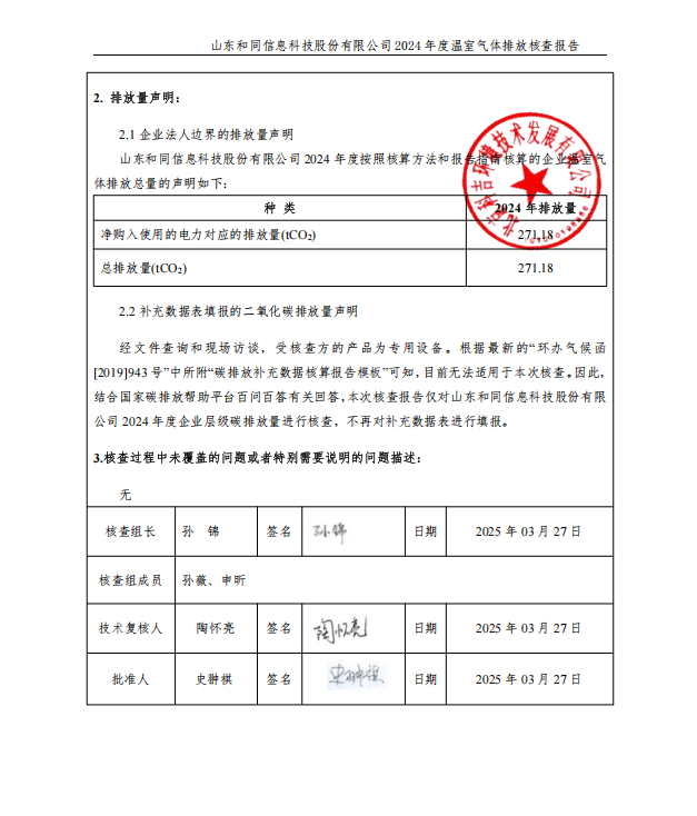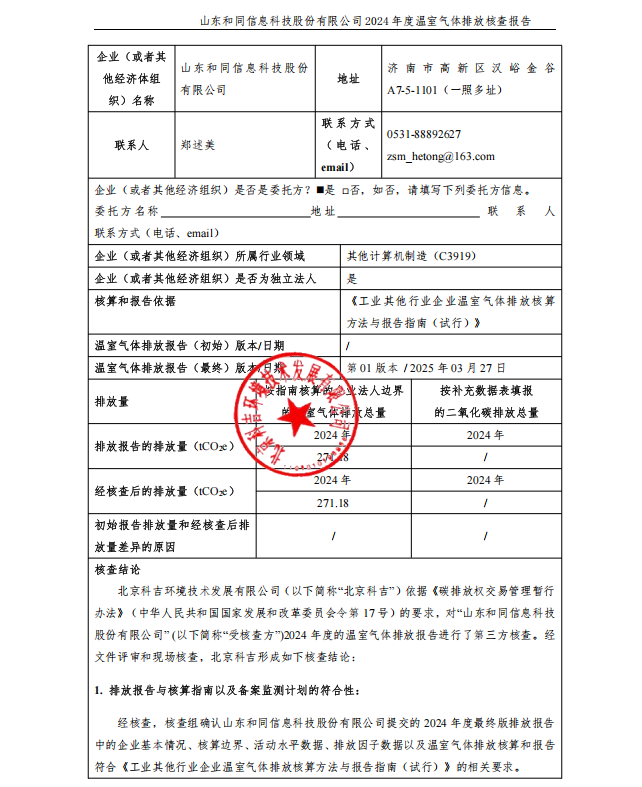 山東和同信息科技股份有限公司2024年度溫室氣體排放核查報告